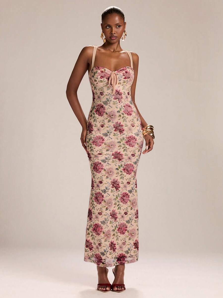 • Spaghetti strap neckline with backless knot detail