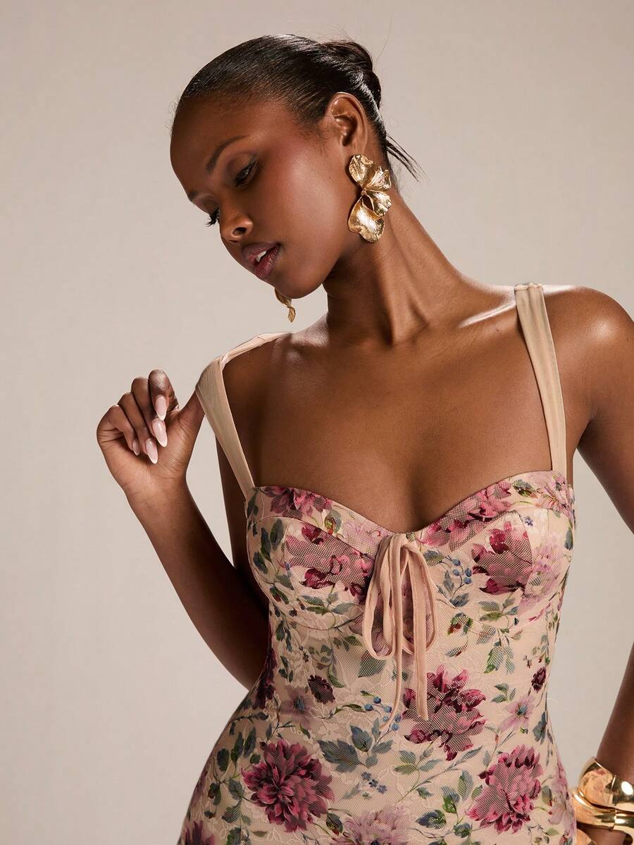 Exude elegance with this apricot base maxi dress adorned with red floral lace. Featuring a slim-fit body, fishtail hem, and delicate spaghetti straps, this lined dress is perfect for weddings, Valentine’s Day, spring and summer events. The backless design with knot and split detailing adds a subtle, sexy touch.